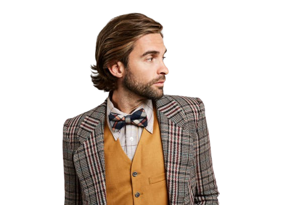 Combina los cuadros de tu chaqueta con los de la pajarita. Usa un color liso para tu chaleco o jersey, boom! Un efecto rompedor