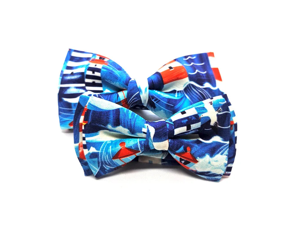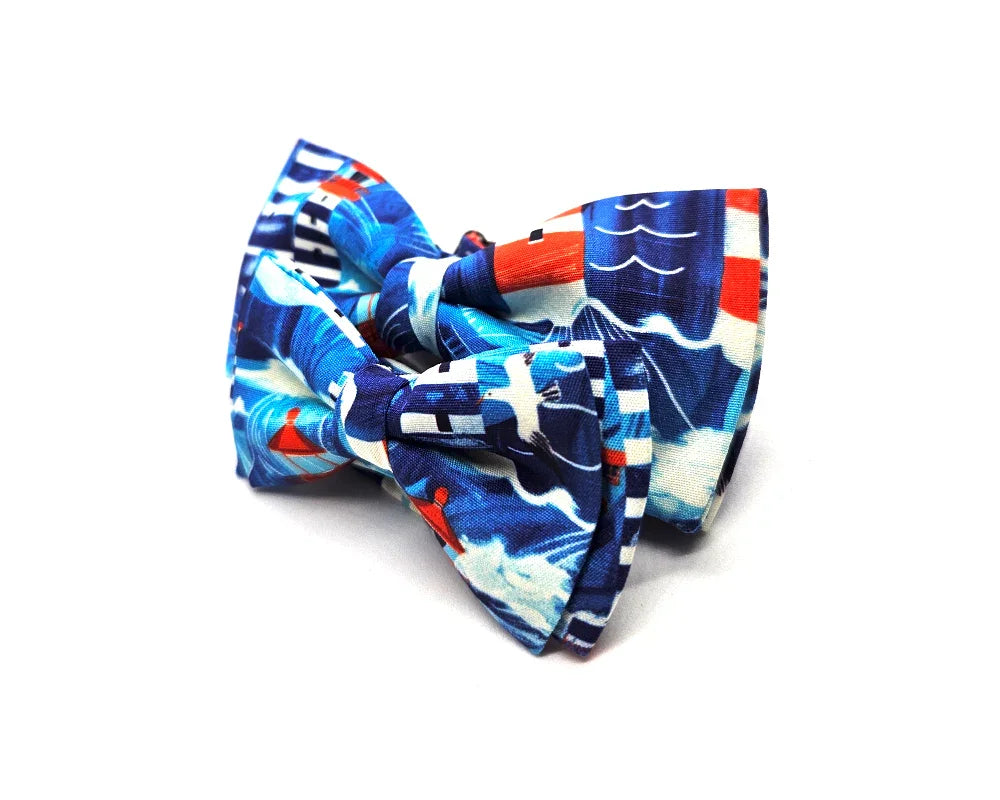Pajarita confeccionada en algodón suave, diseñada en exclusiva por Pitas, Pitas Pajaritas, con un patrón con olas azules de fondo, gaviotas y faros en rojo y blanco y azul y blanco.