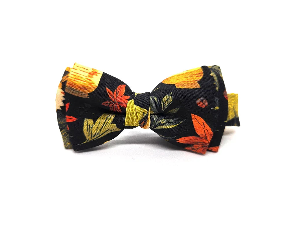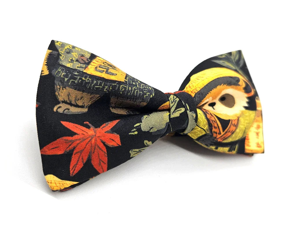 Una pajarita divertida, de fondo negro, con pequeños mapaches atareados recogiendo la siembra. A esto le unimos el detalle de las hojas con sus tonalidades otoñales y ya tenemos una pajarita divertida y original para vestir con camisa blanca.