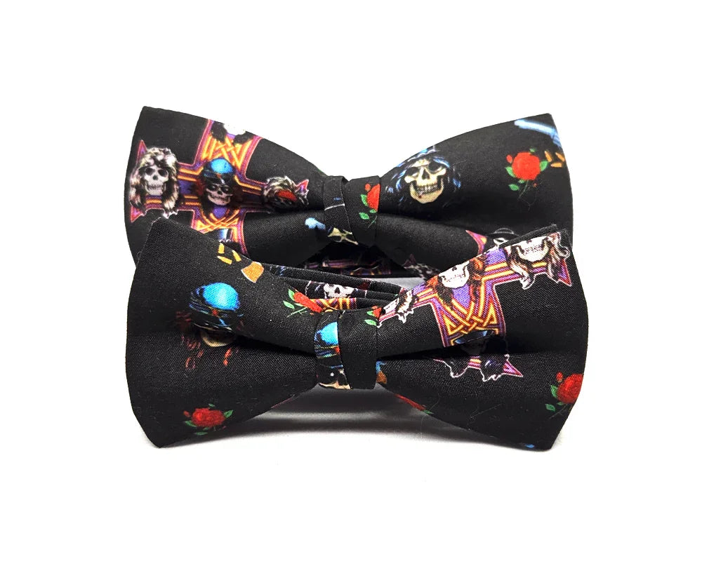 Pajarita confeccionada en algodón, diseñada en exclusiva por Pitas, Pitas Pajaritas, con los iconos de la mitiquísima banda Guns N Roses. Leyendas del rock & roll esta pajarita tiene mucho flow.