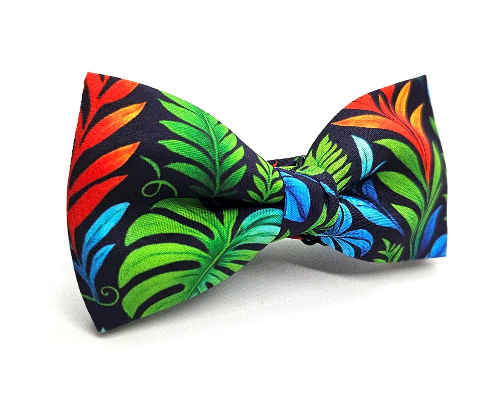 Pajarita confeccionada en algodón suave, diseñada en exclusiva por Pitas, Pitas Pajaritas, con un patrón de fondo azul marino oscuro, con detalles de hojas en verde, azul y rojo.
